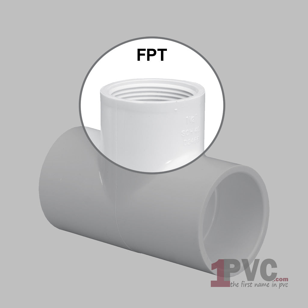 FPT (or FNPT) is where the threads are on the inside of a fitting. This allows a MPT, or Male Pipe Thread, to screw into the female piece. All of our FPT parts are in NPT, National Pipe Thread, which is the type of threading used in the USA. Don't use Teflon tape, teflon paste, or pipe dope with PVC threaded connections. Use a sealing compound that is compatible with plastics.