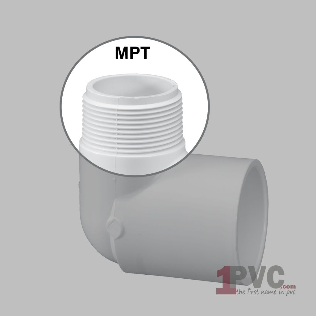 MPT (or MNPT) is where the threads are on the outside of a fitting. This allows the MPT to screw into the matching FPT size. All of our MPT parts are NPT, National Pipe Thread, which is the type of threading used in the USA. Don't use Teflon tape, teflon paste, or pipe dope with PVC threaded connections. Use a sealing compound that is compatible with plastics.