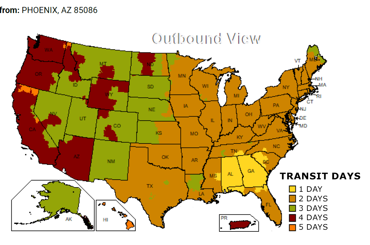 Our main shipping facility is just outside of Phoenix, Arizona, USA. However, your order may ship from one of a handful of distribution facilities located throughout the United States. This map is an estimated time in the transit map for orders shipping via UPS Ground.